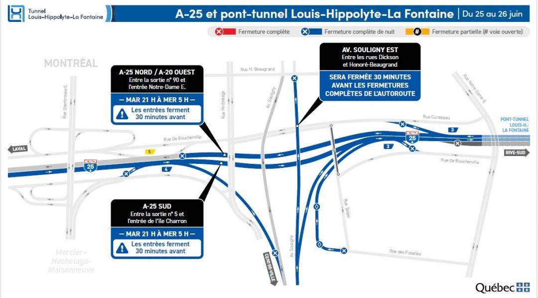 L’autoroute 25 (incluant le tunnel Louis-Hippolyte-La Fontaine) sera fermé à la circulation dans les deux directions dans la nuit du mardi 25 juin au mercredi 26 juin, ainsi que dans la nuit suivante, du mercredi au jeudi.